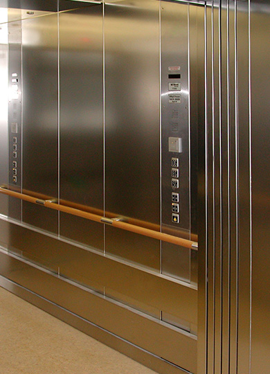 Die Tragfähigkeit jedes einzelnen Aufzugs der 3er-Gruppe beträgt 2.500 kg und ist somit für den Transport von Krankenhausbetten mitsamt Begleitpersonal geeignet. Um die Kabinenwände mit den Betten nicht zu beschädigen, wurden umlaufende Rammschutzleisten aus Edelstahl montiert. Auch die übrigen Kabinenwände sind mit Edelstahl-Peneelen ausgekleidet. Aufgrund des in den Handlauf integrierten Bedientableaus sind die Aufzüge behinderten- bzw. rollstuhlgerecht.