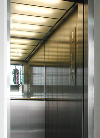 Der seilbetriebene Aufzug ist maschinenraumlos. Das bedeutet, die Maschine (Motor, Treibscheibe etc.) befindet sich hier im Schachtkopf. Die Kabinen sind einseitig über Edelstahl-Teleskoptüren begehbar.